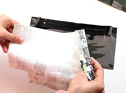 Place the lining on top, right side down as shown below matching the raw edge of the lining with the zipper. Sew the three layers together using a seam allowance of 3/8″.